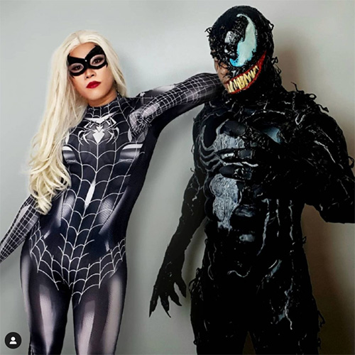 Stand back, Spider-Man fans! Who says you can't dress up in a Spider-Man themed costume and dress as one of his any foes? Pictured above is a stunning Venom suit, complete with part of the cosplayer's face exposed to show the binding in process. We love Venom's costume pictured above, as well as the dark Spider-Man suit next to him, which is a creative spin on a Spider-Man themed costume.